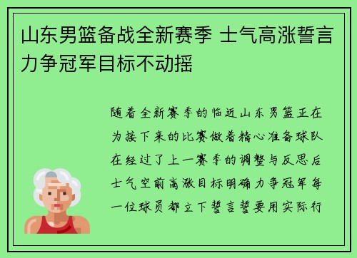 随着全新赛季的临近,山东男篮正在为接下来的比赛做着精心准备。球队在经过了上一赛季的调整与反思后,士气空前高涨。目标明确——力争冠军!每一位球员都立下誓言,誓要用实际行动去兑现这一目标。这支球队不仅在人...