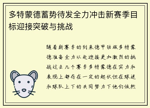 随着新赛季的到来,德甲劲旅多特蒙德准备全力以赴,迎接更加激烈的挑战。过去几个赛季,多特蒙德在实力和表现上都存在一定的起伏,但在球迷和球队上下的共同努力下,他们依然保持了竞争力。新赛季的目标明确,那就是...